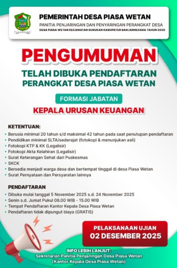 Pembentukan Panitia Penjaringan dan Penyaringan Perangkat Desa Piasa Wetan Jabatan Kaur Keuangan